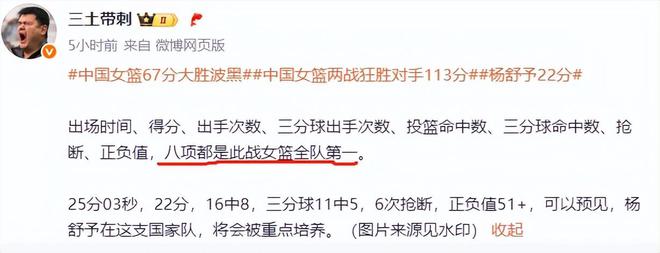 杨舒予昨晚出战25分03秒,22分,16中8,三分球11中5,6次抢断,正负值51+,两战共得32分,仅比张子宇少2分,也就是说两战全队得分第二多。媒体人“三士带刺”充分肯定和赞扬了她,“可以预见,杨舒予在这支国家队,将会被重点培养。赛后,主教练宫鲁鸣也带杨舒予到新闻发布会,足见对她的喜欢和重视。